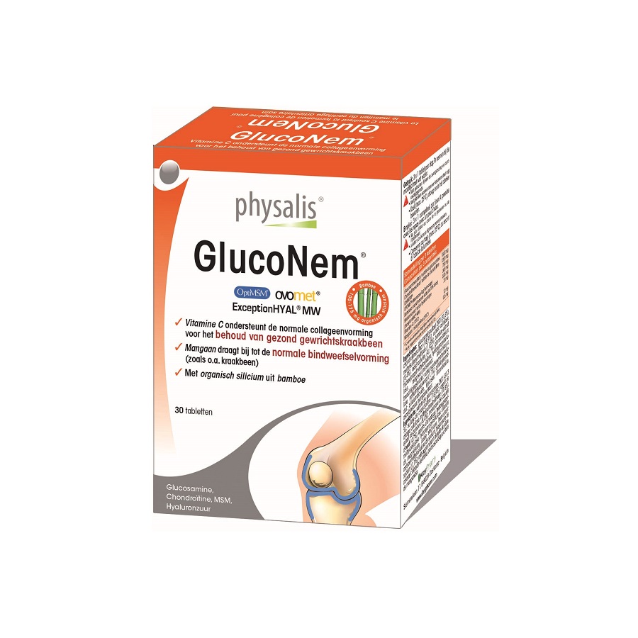 Gucosaminesulfaat KCl (31,6%), chondroitinesulfaat (19%); vulstoffen: cellulose, natriumcarboxymethylcellulose, methylsulfonylmethaan (11,9%), eischaalvlies (7,9%), bamboe-extract (6,7%); glansmiddelen: hydroxypropylmethylcellulose, talk, ascorbinezuur, magnesiumstearaat; antiklontermiddel: silicumdioxide; kleurstof: titaandioxide; bevochtigingsmiddel: glycerine, mangaancitraat