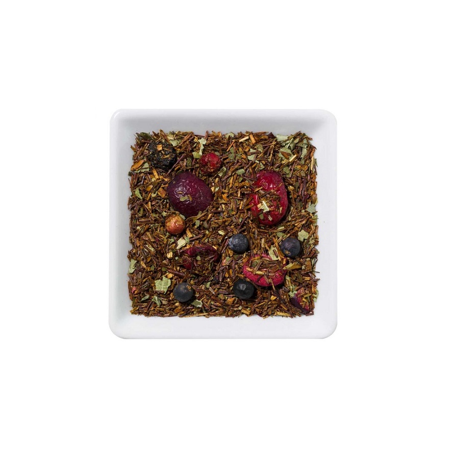 Rooibos thee, jeneverbessen, bramen, bessen bladeren (zwarte bessen bladeren), zoete zwarte bessen bladeren, aroma, cranberry plakjes, frambozen, bosbessen, rode bosbessen.